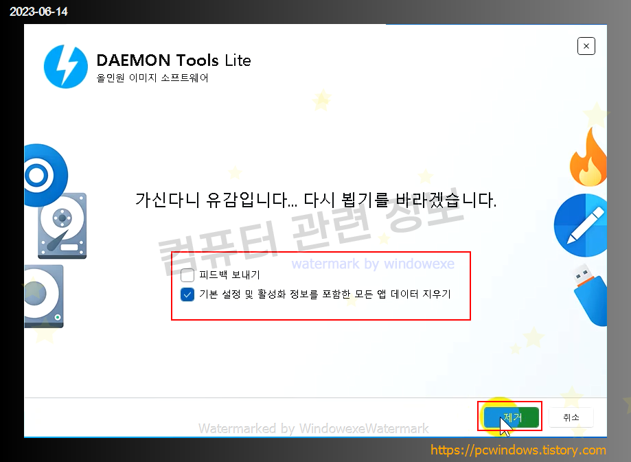 피드백은 필요없으므로 체크해제, 기본 설정 파일을 모두 지우려면 앱 데이터 지우기 체크하고 제거 클릭
