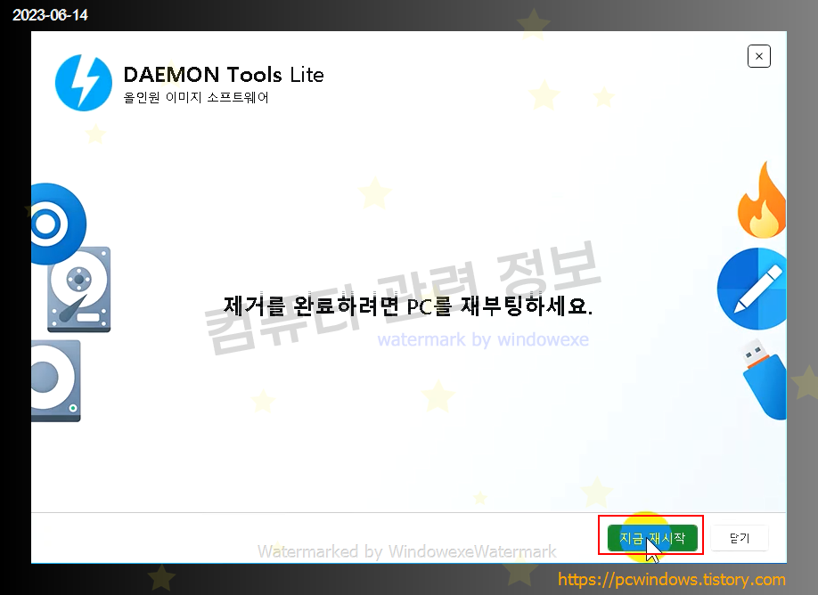 일부 파일은 삭제되지 않으므로 시스템을 재시작 해야 됩니다. 재시작 클릭. (나중에 재시작해도 무방)