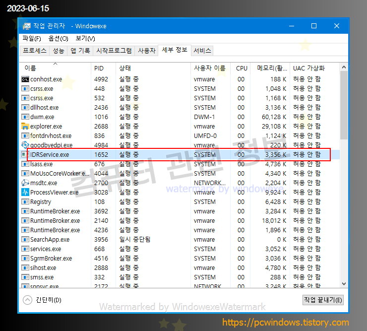 IDRService.exe 프로세스는 시스템 부팅시마다 자동으로 실행됩니다. 본문 하단 서비스 로그 참고.