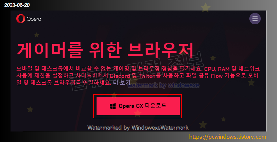 위 링크로 이동해서 Opera GX 다운로드를 클릭하세요.