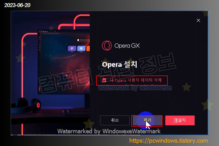 Opera GX 사용자 데이터를 모두 삭제하려면 사용자 데이터 삭제에 체크하고 제거 클릭