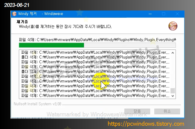 잠시 기다리면 프로그램이 제거되고, 프로그램 설치시 같이 설치된 Everything (Windy 필수 프로그램)도 같이 삭제됩니다.