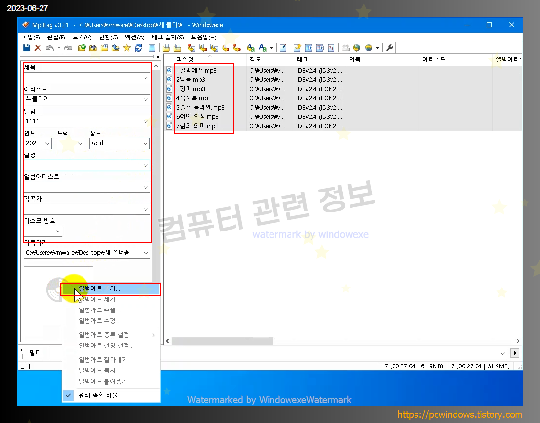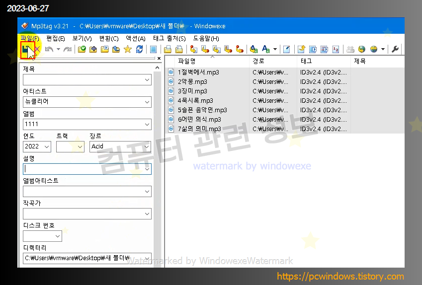 바꾸고 싶은 노래파일을 선택하고 좌측 패널에서 바꾸고 싶은 태그 항목을 변경하면 됩니다.