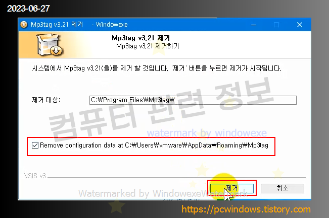 프로그램을 성공적으로 제거하였습니다. 닫음 클릭