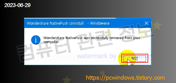 프로그램이 정상적으로 제거되었습니다. 확인 클릭.