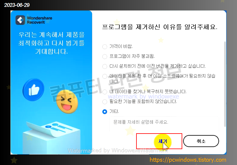 프로그램을 삭제할건지 물어보는데 예 클릭.