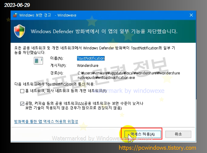 방화벽 보안 경고 메세지가 나오면 액세스 허용을 클릭하세요.
