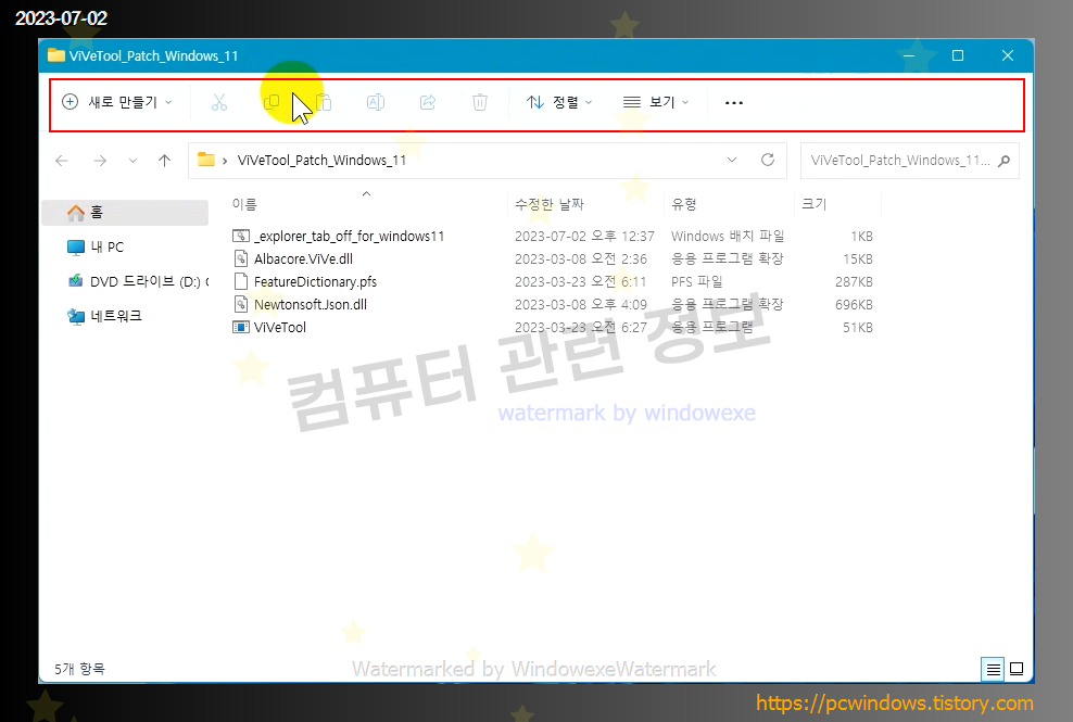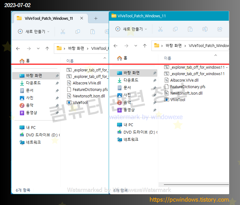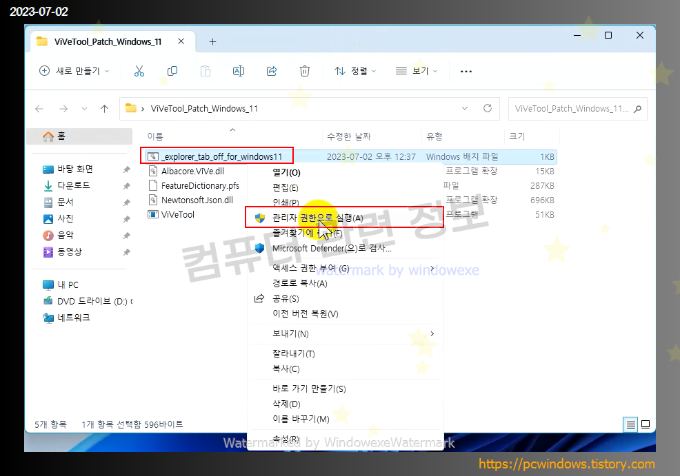 탐색기 탭 기능을 원래대로 설정하려면 _explorer_tab_on_for_windows11.bat 파일을 같은 방법으로 관리자 권한으로 실행하고 재부팅을 하면 됩니다.