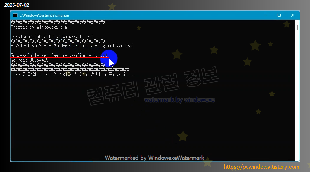 파일 실행후 Successfully set feature configuration(s) 이런 메세지가 나오고 배치파일은 5초후 종료됩니다.
