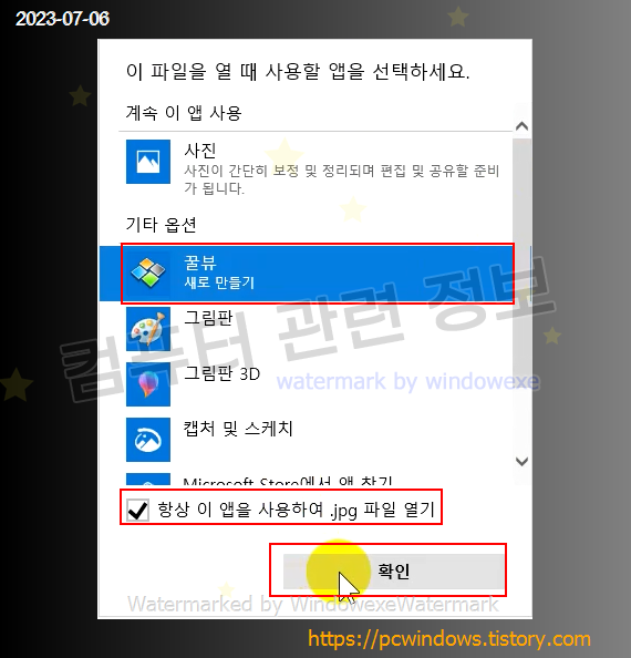 꿀뷰로 계속 보고 싶으면 꿀뷰를 선택하고 항상 이 앱을 사용하여 열기에 체크하고 확인 클릭