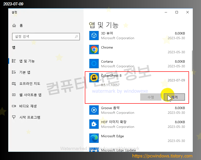 CyberGhost 8 을 찾아서 제거 클릭