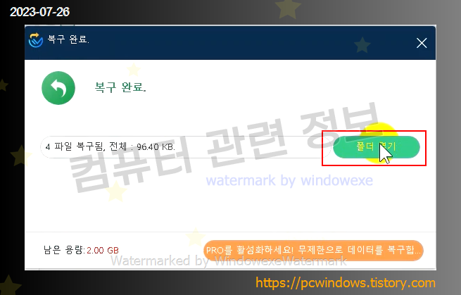 잠시 기다리면 복구 완료 메세지가 뜹니다. 폴더 열기 클릭