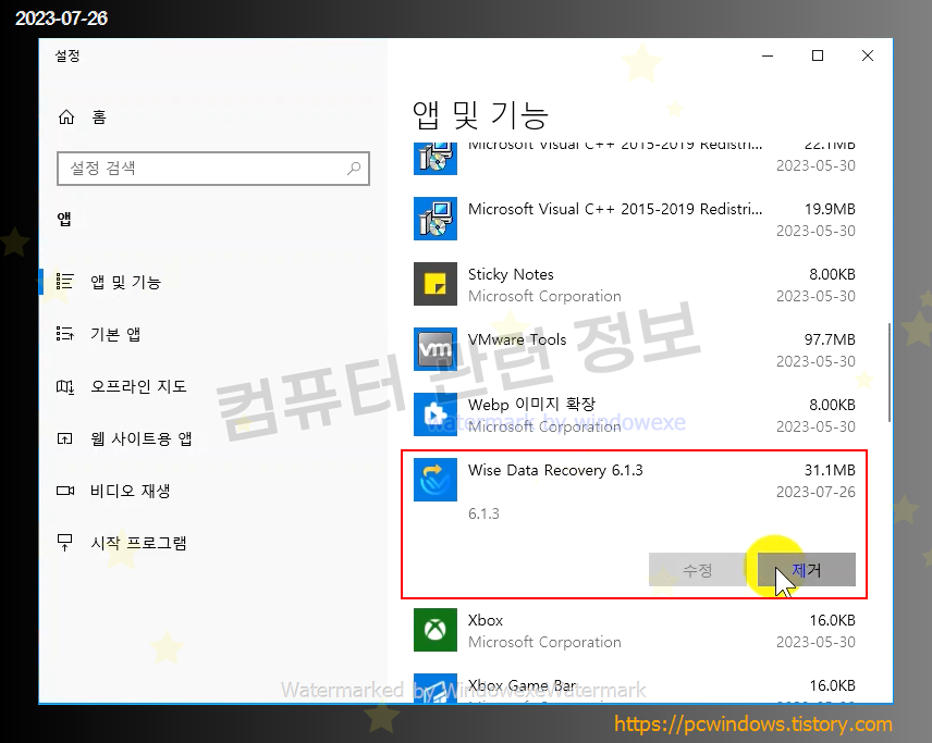 Wise Data Recovery 를 찾아서 제거 클릭