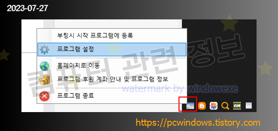 작업표시줄 오른쪽 시스템 트레이에 네모난 창 모양의 아이콘이 생기는데 우클릭하고 설정을 클릭하세요.