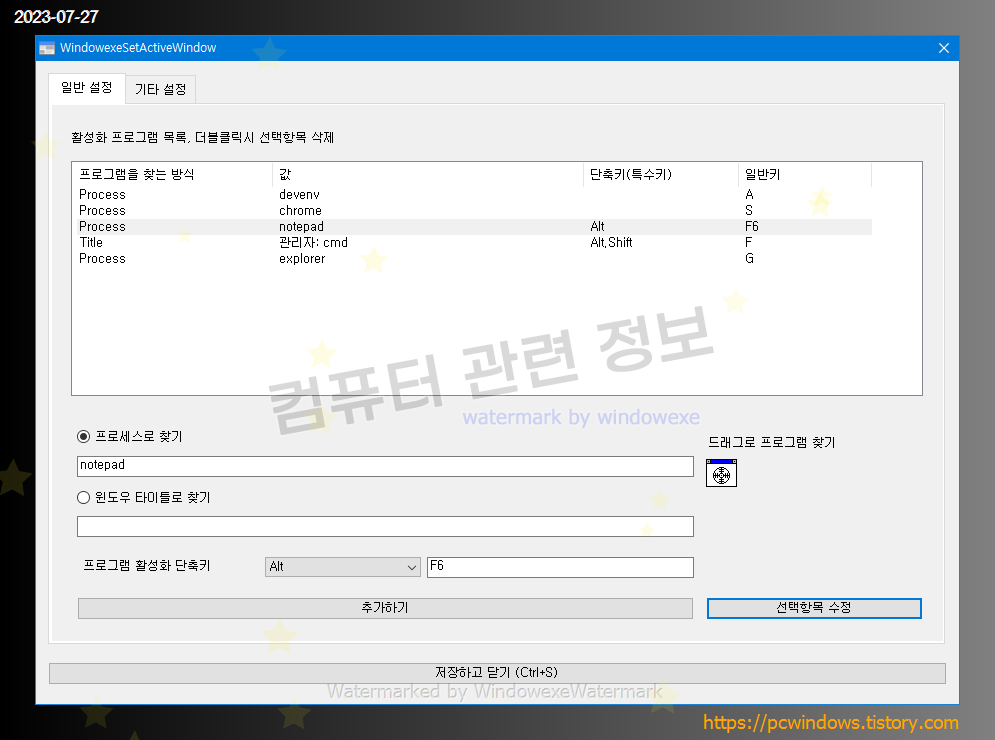 프로세스 또는 윈도우 타이틀 중에 원하는 항목을 체크하고 단축키를 지정하세요.