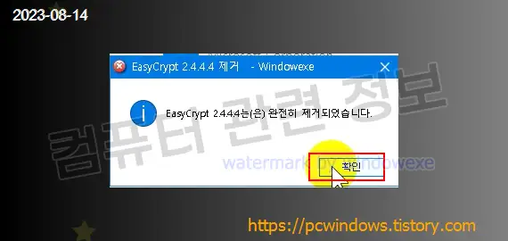 프로그램이 정상적으로 제거되었습니다. 확인 클릭.