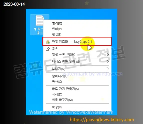 윈도우 탐색기에서 암호화할 파일을 선택하고 마우스 우클릭 - 파일 암호화 EasyCrypt 2.4 를 클릭하세요.