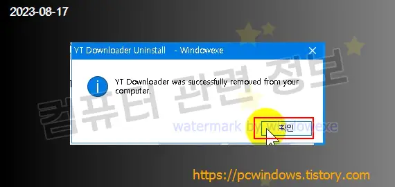프로그램이 정상적으로 제거되었습니다. 확인 클릭.