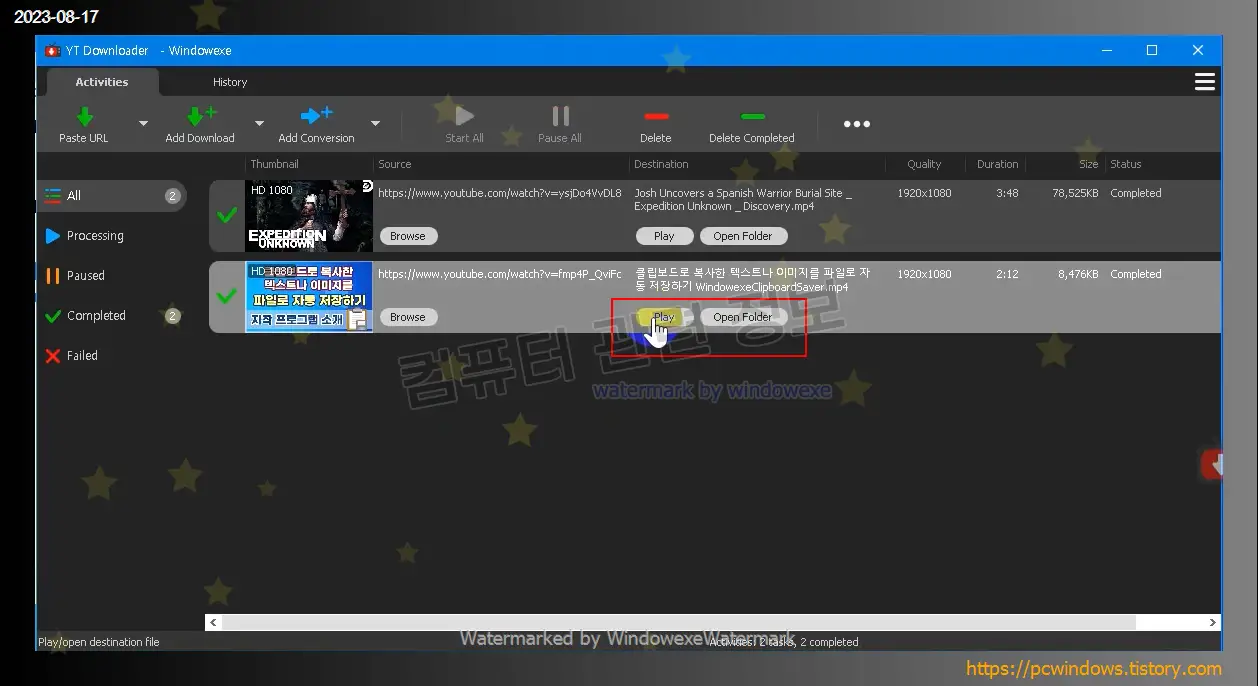 동영상 다운로드가 완료되면 Play , Open Folder 버튼이 활성화됩니다.