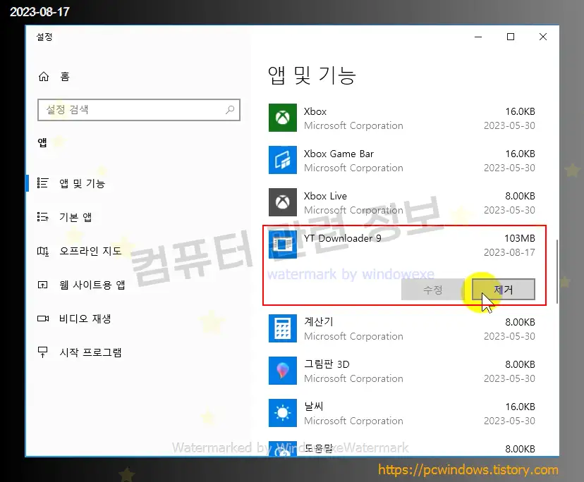YT Downloader 를 찾아서 제거 클릭