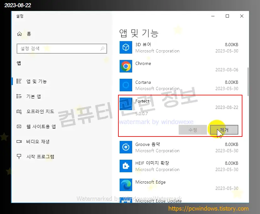 Fortect 를 찾아서 제거 클릭