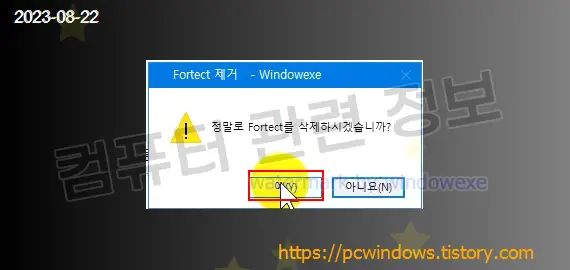 프로그램을 삭제할건지 물어보는데 예 클릭.