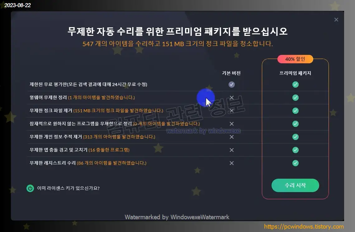 라이선스 : 유료, 시스템 검사만 무료고, 문제 해결은 제품 등록 필요