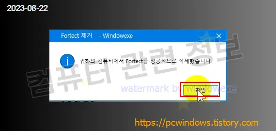 프로그램이 정상적으로 제거되었습니다. 확인 클릭.