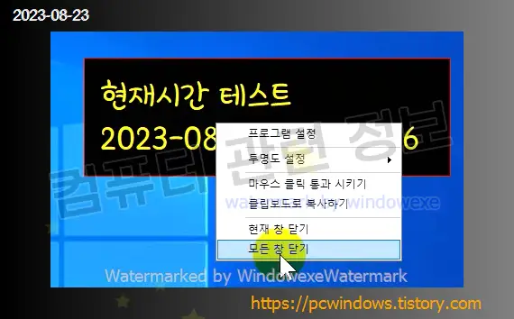 투명도 설정, 마우스 클릭 통과, 클립보드로 복사하기, 창 닫기 메뉴가 있습니다.