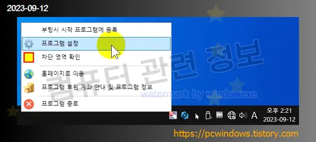 설정에서 추가한 차단 영역이 모두 표시됩니다. 좌클릭 창 닫기