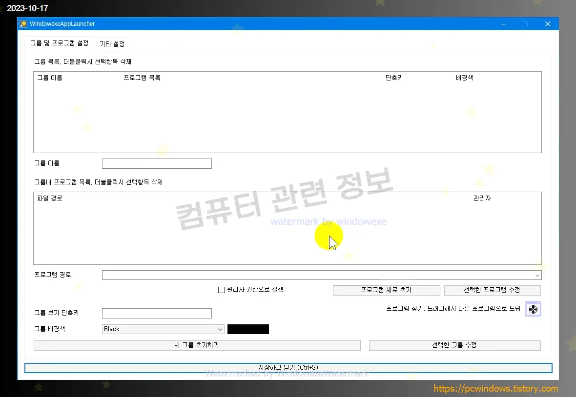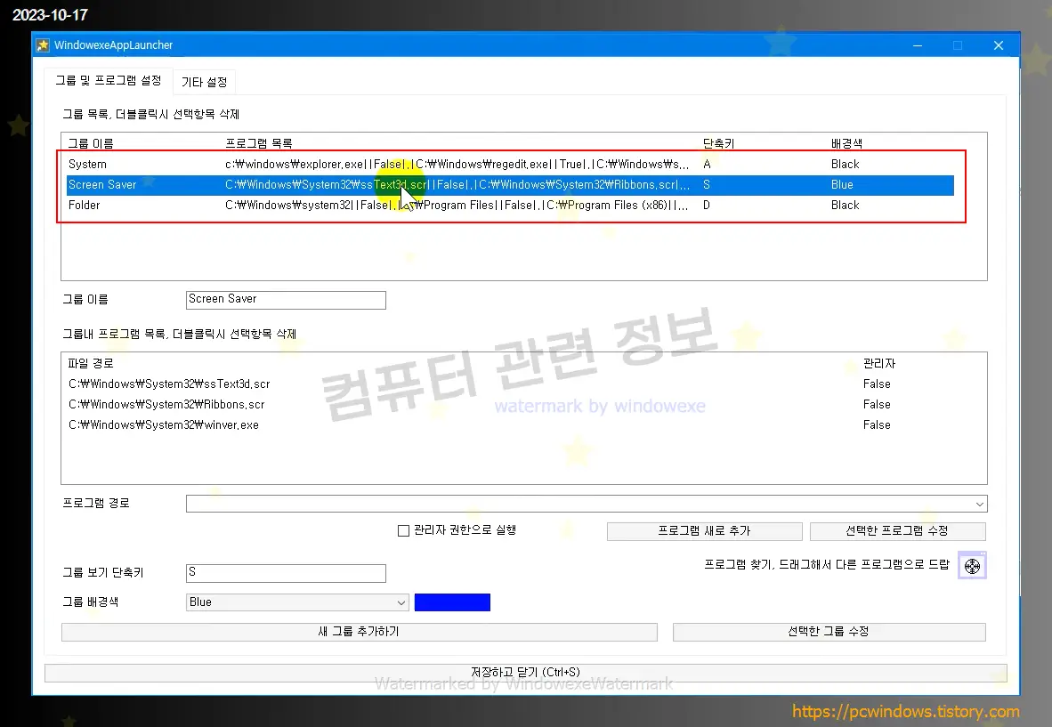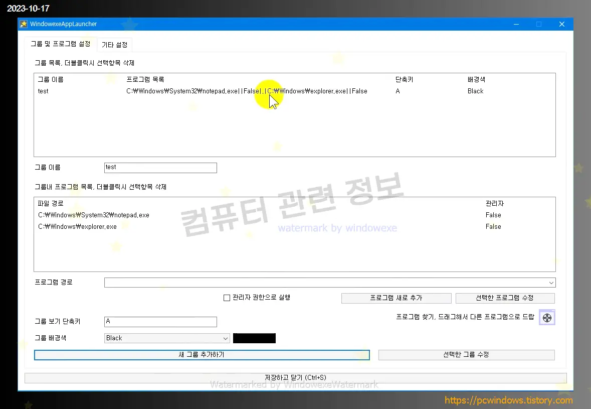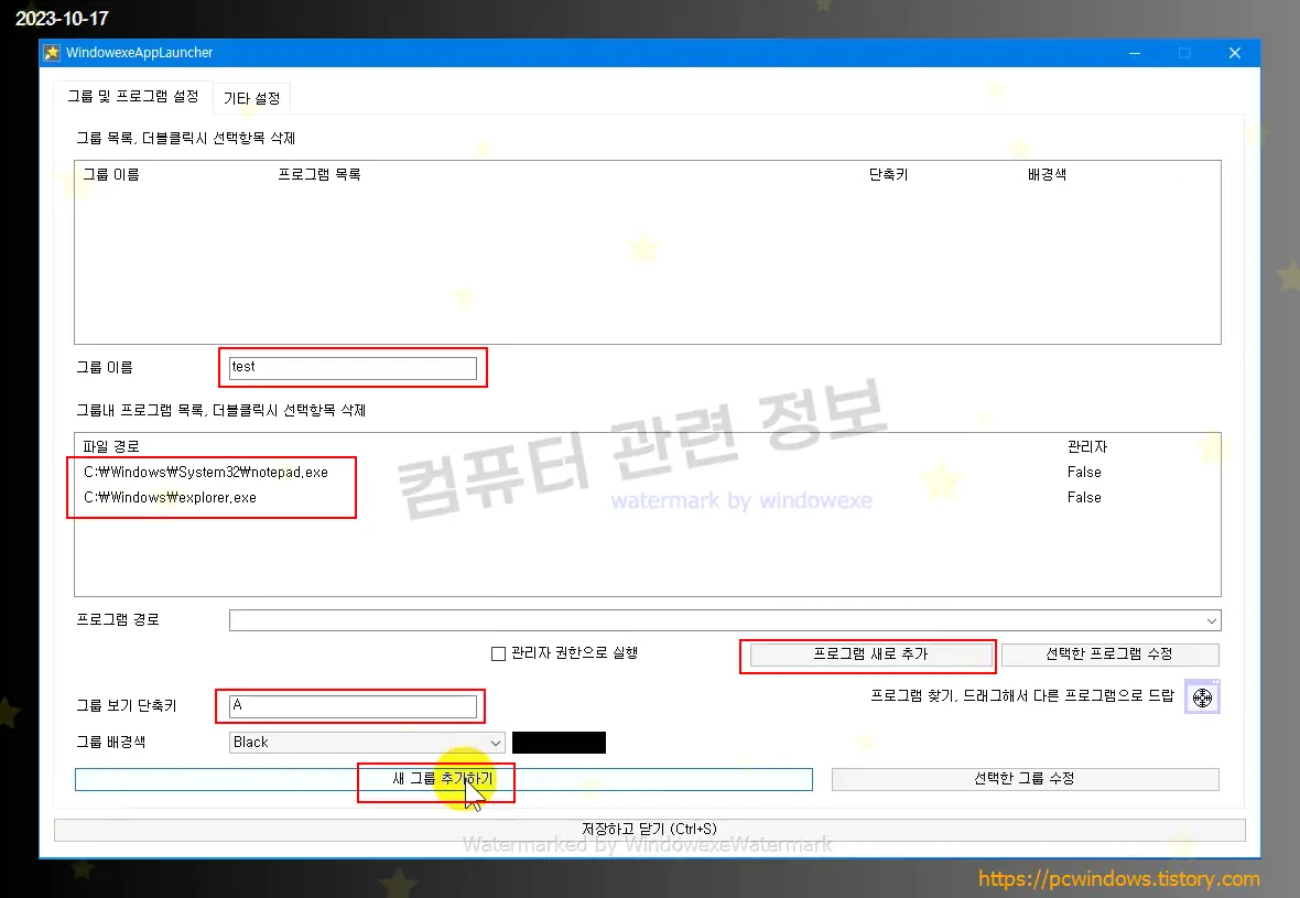 그룹 이름을 쓰고, 아래에 프로그램 경로에서 추가하고 싶은 프로그램 경로를 적고 프로그램 새로 추가를 클릭하세요.