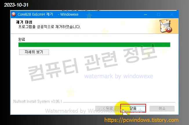 프로그램 제거가 완료되었습니다. 닫음 클릭