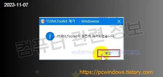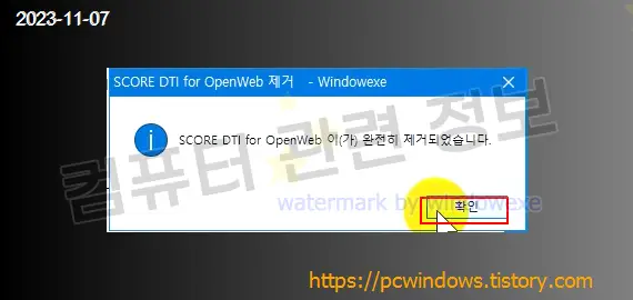 프로그램이 정상적으로 제거되었습니다. 확인 클릭.