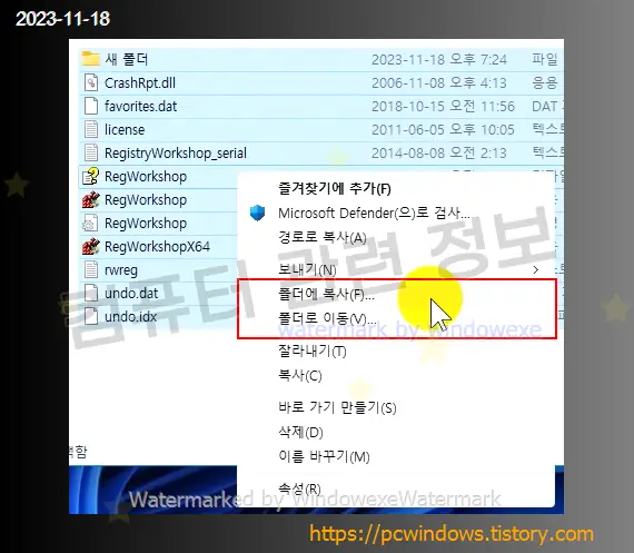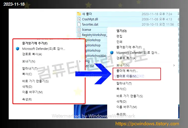 윈도우 탐색기에서 폴더나 파일을 선택하고 우클릭할 때 폴더에 복사, 폴더로 이동 메뉴를 추가하는 방법에 대해 알아보겠습니다.