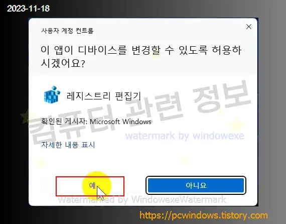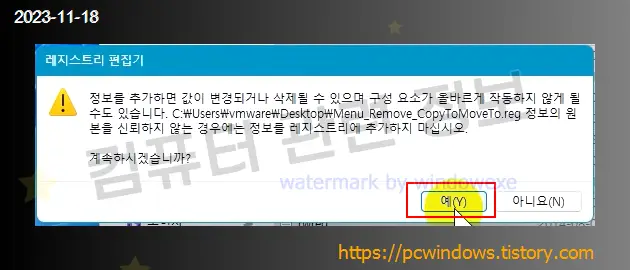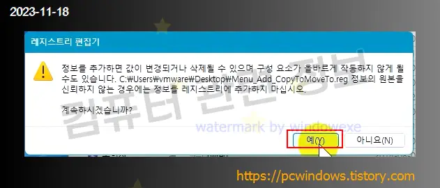 레지스트리 정보를 추가할 건지 물어보는데 예 클릭