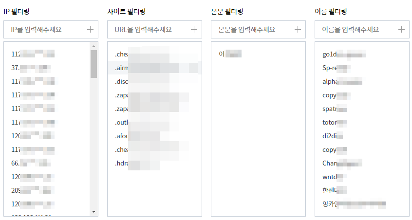근데 티스토리 스팸 댓글 설정 자체가 수동으로 일일이 추가하는 방식이라서 데이터가 많아지면 작업시간이 오래 걸릴 수도 있습니다. (매크로 프로그램 필요)