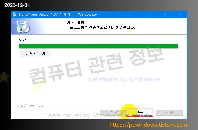 프로그램이 정상적으로 제거되었습니다. 닫음 클릭.