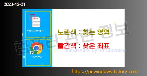 노란색은 찾는 영역이고 그 안에 있는 빨간색은 지정한 색을 찾았을 때 표시되는 좌표입니다.