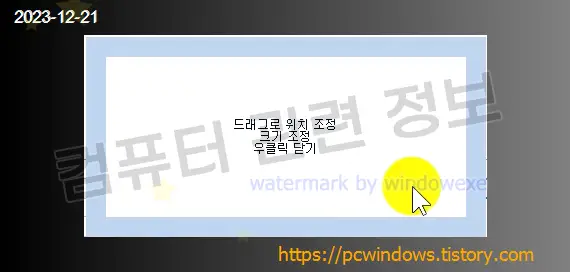 마우스로 드래그를 하거나 크기를 조정하고 마우스 우클릭하면 설정화면의 좌표 및 크기 값이 변경됩니다.