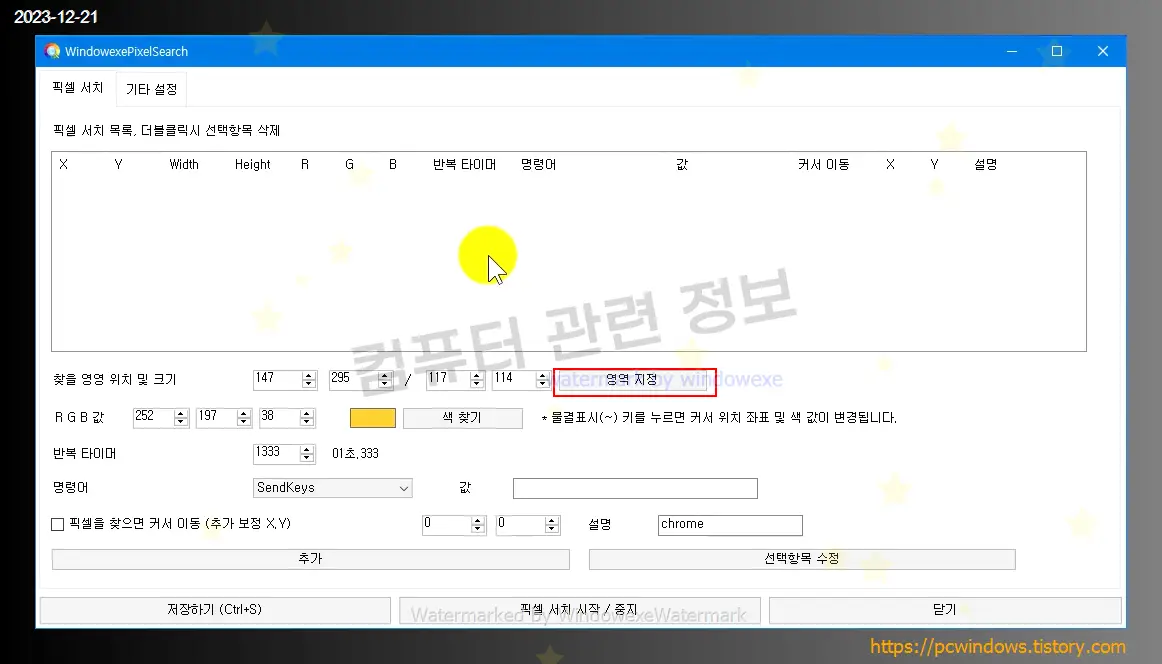 저장을 누르고, 픽셀 서치 시작 / 중지를 클릭하면 지정한 영역에서 색을 찾고, 색을 찾게 되면 해당 명령어를 실행합니다.
