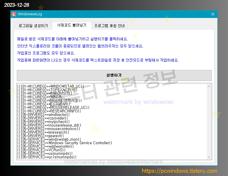 로그파일을 분석하여 개쓰레기 프로그램의 삭제코드가 메일로 보내지는데 삭제코드를 모두 복사하여 [삭제코드 붙여넣기]탭에 붙여넣고 [실행하기]를 누르면 됩니다.