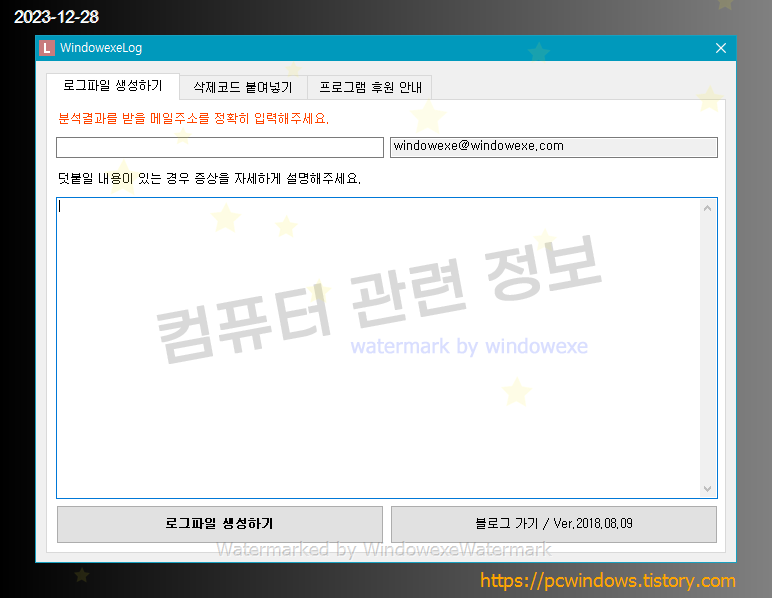 로그파일(WindowexeLog.log)이 생성되면 이 파일을 windowexe@windowexe.com 메일로 보내주세요.
