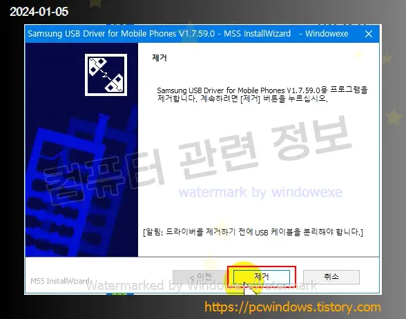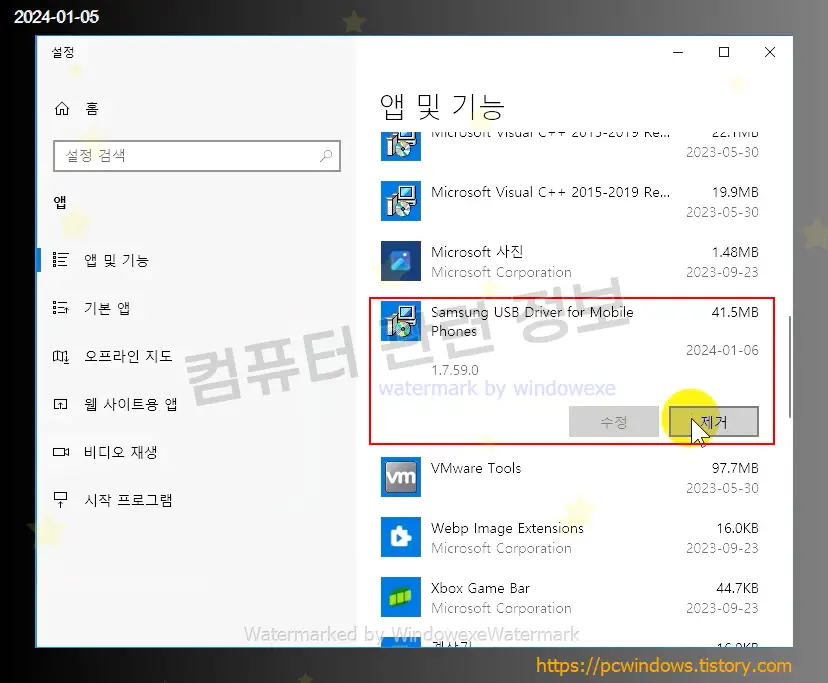 Samsung USB Driver for Mobile Phones 를 찾아서 제거 클릭