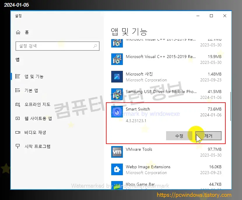 시작 - 우클릭 - 앱 및 기능 실행. (윈도우 11에서는 설치된 앱)
