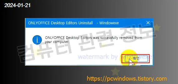 프로그램이 정상적으로 제거되었습니다. 확인 클릭.