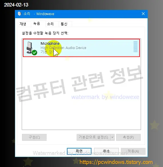 소리 속성을 열고 녹음 탭으로 이동해서 현재 사용중인 마이크를 더블클릭하세요.