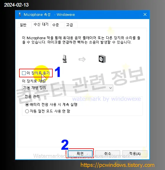 마이크로폰 속성에서 수신대기 탭으로 이동하면 이 장치로 듣기에 체크가 되어 있을 텐데요.