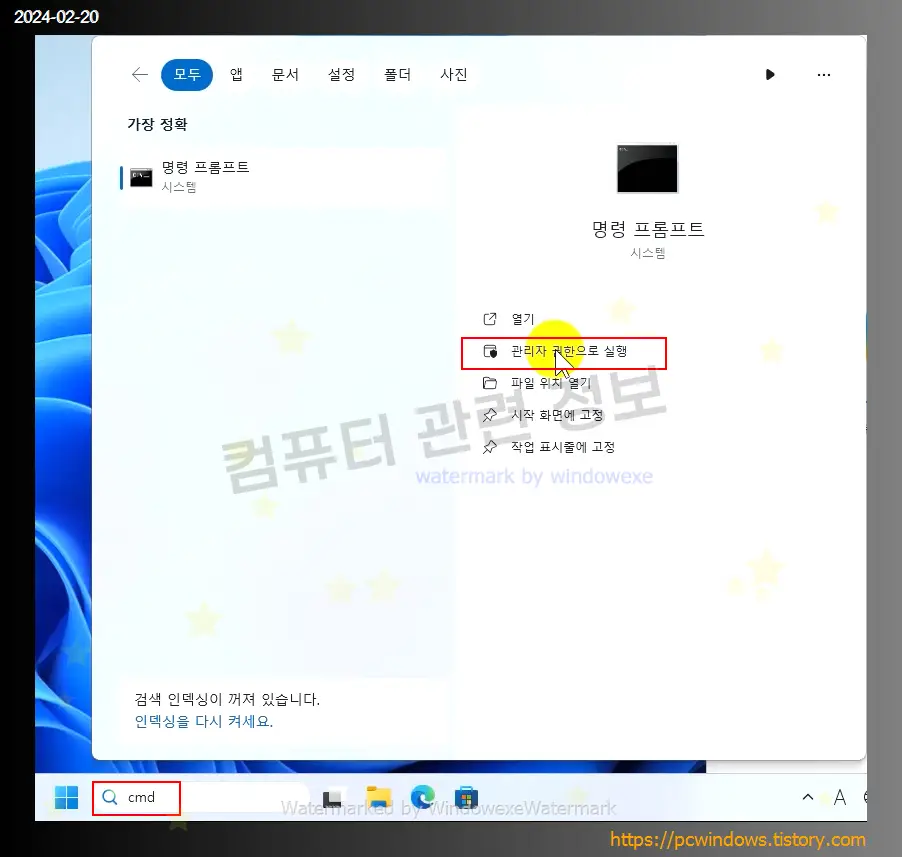 시작 메뉴 - 검색에서 cmd 를 입력하고 오른쪽 패널의 관리자 권한으로 실행을 클릭하세요.