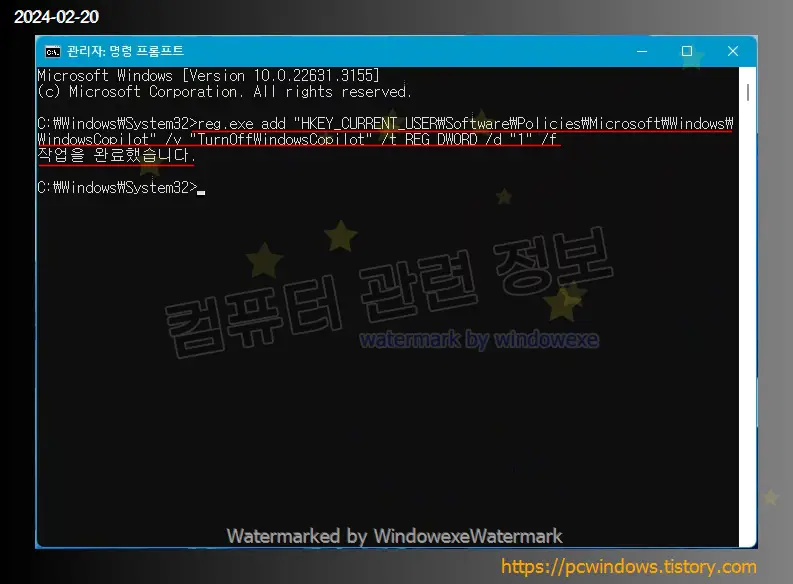 앞서 추가한 TurnOffWindowsCopilot 레지스트리를 삭제하는 명령어인데 제가 테스트한 컴퓨터에서는 이 작업을 하더라도 원래대로 표시가 되지 않더군요. 왜 그런건지는 모르겠습니다.