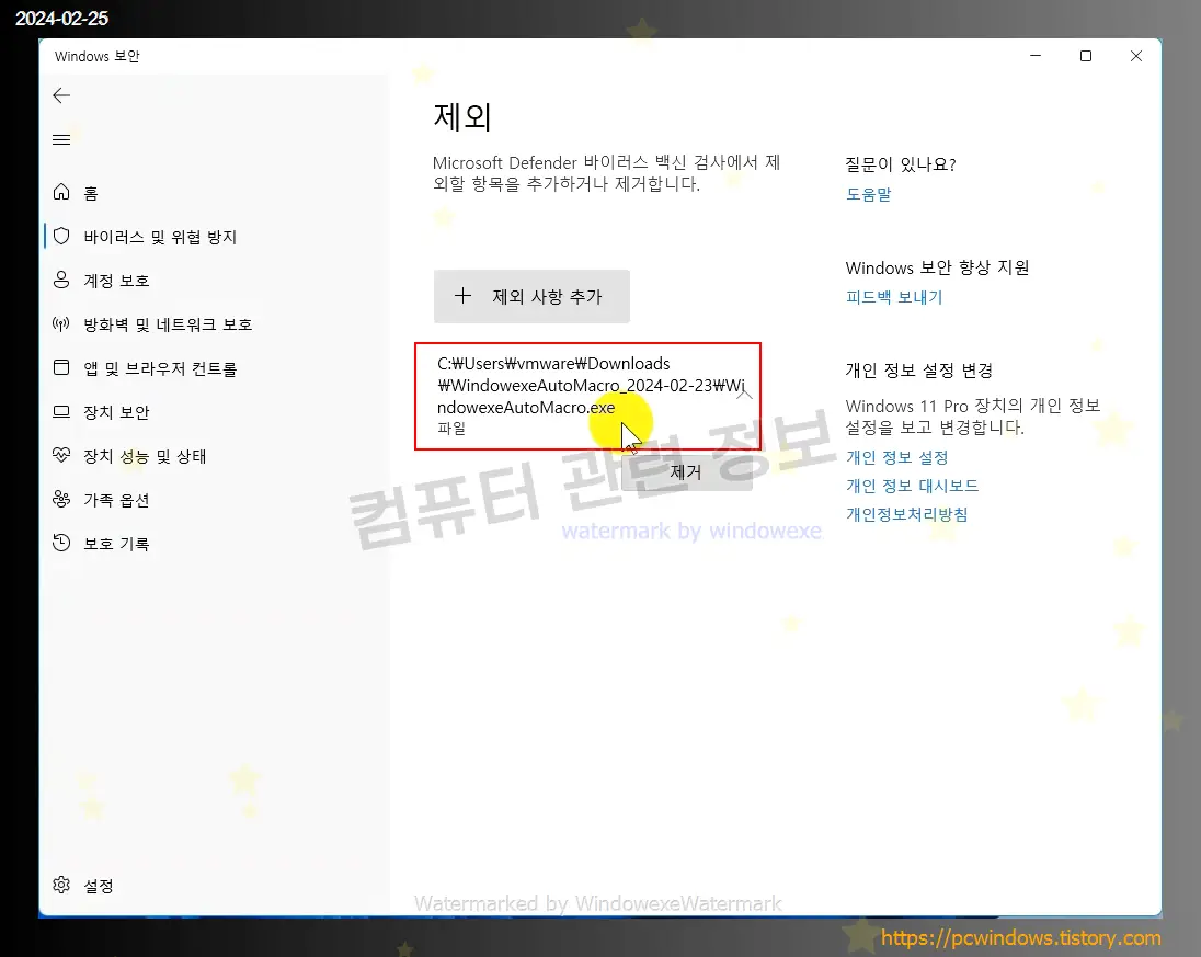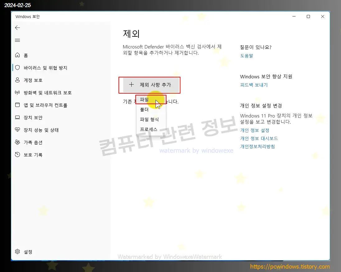 제외 사항 추가를 클릭해서 파일을 클릭하세요. 폴더를 클릭해도 상관은 없습니다.